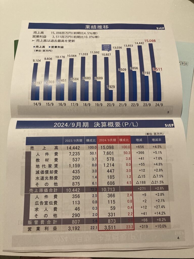 社長さんをはじめ数人の方が業績や今後の方針を説明していました。皆さんおそらく塾の講師経験者だろうと思われるのですが、説明がとってもわかりやすかったです。スライドと資料を見ながら話を聞いていました。