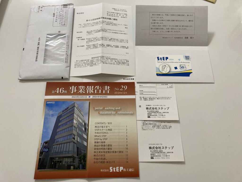 総会から4日後には封筒が届いて、優待のクオカード(会社のロゴ入り)と配当金計算書、事業報告書なるものが入っていました。